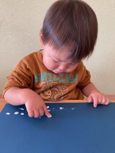 ツリーの周りは指スタンプをして雪を表現しました❄