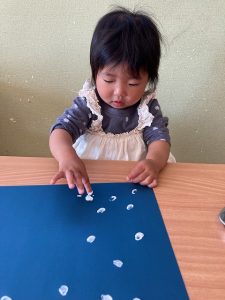 ツリーの周りは指スタンプをして雪を表現しました❄