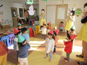 手作りの三角帽子をかぶって準備万端の子どもたち👍