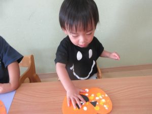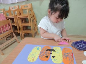 「かぼちゃおばけだー!!」と言いながら楽しんで取り組んでいました♬
