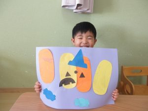 そらぐみさんは、画用紙に絵を描き、かぼちゃの顔を自分たちで貼りました。