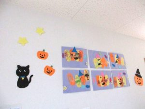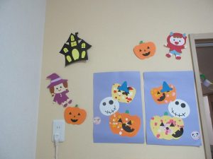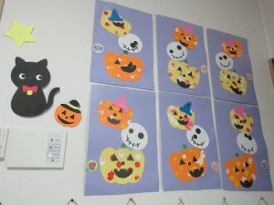 つきぐみさんのお友だちはがいこつの目・かぼちゃの口と帽子は自分たちで貼りました👏