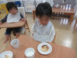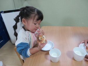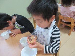 午後のおやつは給食の先生がオバケドーナツを作ってくれました👻